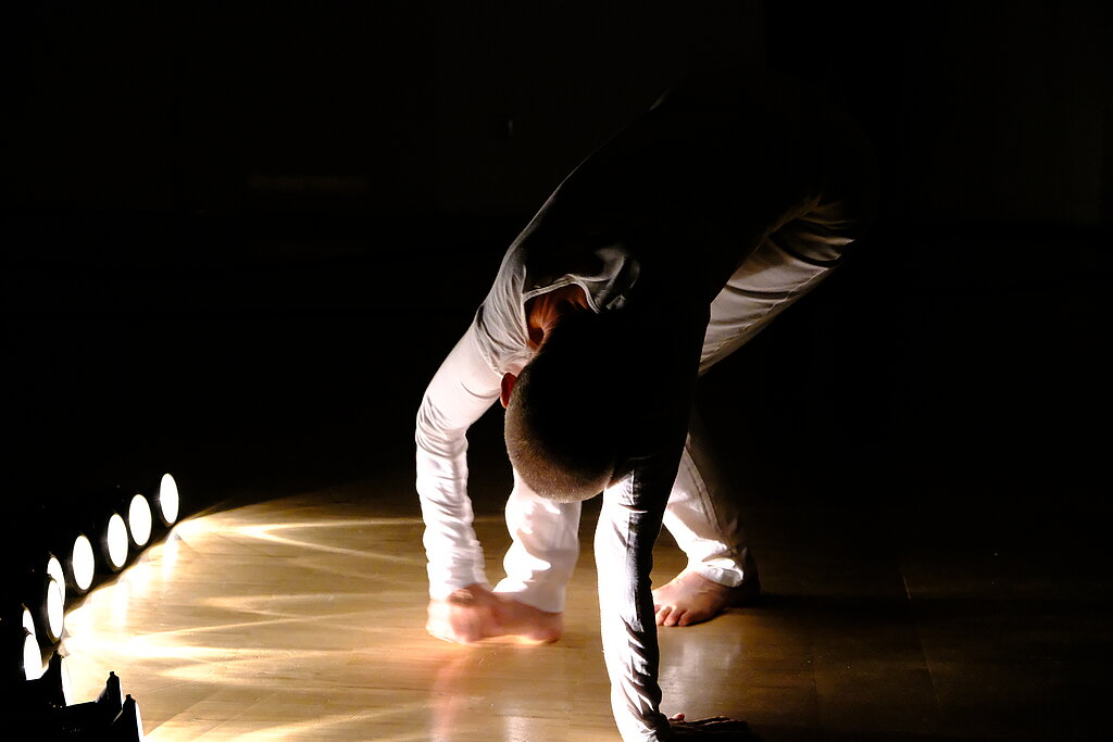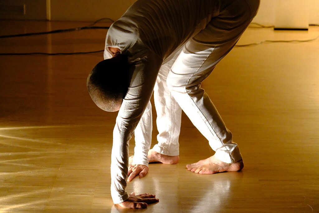 TanzRAUM: Fine Kwiatkowski wechselt in ihrer äußerst eigenständigen Bewegungswelt immer wieder die Perspektiven; als Skulptur verharrend, als Wesen nicht greifbar. Dabei offenbart sie subtile Einblicke in innere Zustände, die jeder kennt.