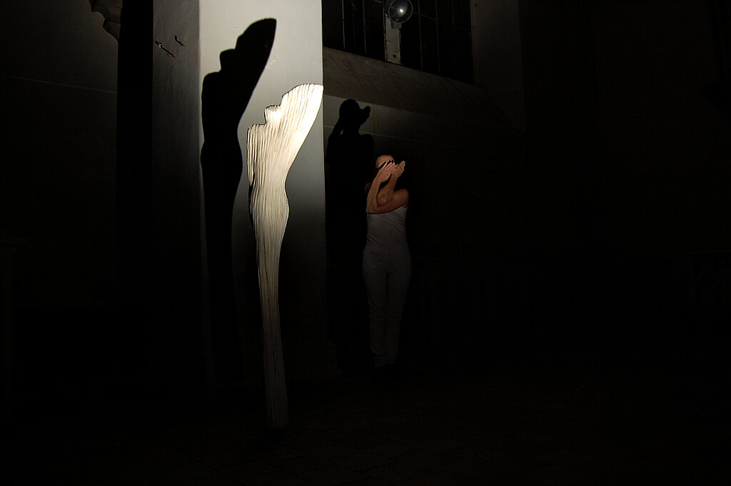 Und ihre Arbeiten, die uns sofort faszinierten. In diesem Jahr konnten wir (Duo cri du coeur) unsere erste Zusammenarbeit realisieren. In unserer Reihe "Nächte des Lichts" beteiligten sich Madeleine Saludas und Thorsten Bisby-Saludas mit 6 Skulpturen. Sie brachten mit ihren Arbeiten in weiß und schwarzbraun, durch Licht riesige Schatten an die Wände werfend, eine Atmosphäre in die ansonsten dunkel gehaltene Nikolaikirche in Pasewalk, die sofort gefangen nahm.