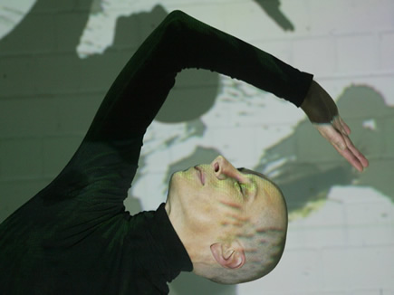 Die Bewegung der Tänzerin löst die Klänge aus, manipuliert sie, durch die computergesteuerte Auswertung der Videobilder ihrer Bewegung in Relation zu den projizierten Zeichen - in Interaktion mit den unverstärkten / unverfremdeten Klängen des Kontrabasses.